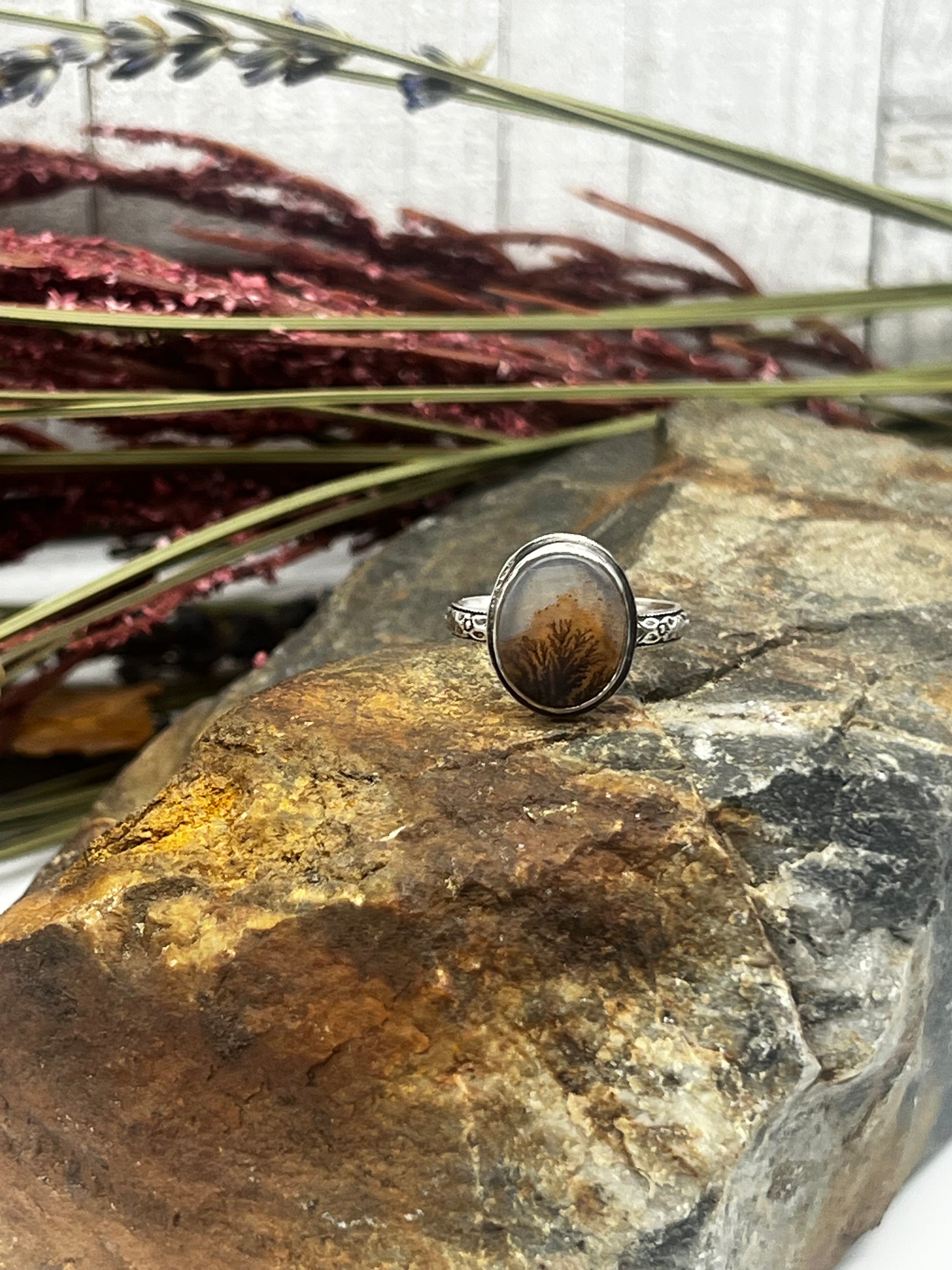 Dark Brown vine with Golden/Orange Background Dendritic Agate Oval Ring set in 925 Sterling - Size 7.5 - petite 925 Sterling Silver decorative stamped band - Matte Finish; stamped with the Tahoe Mtn Maker’s Mark