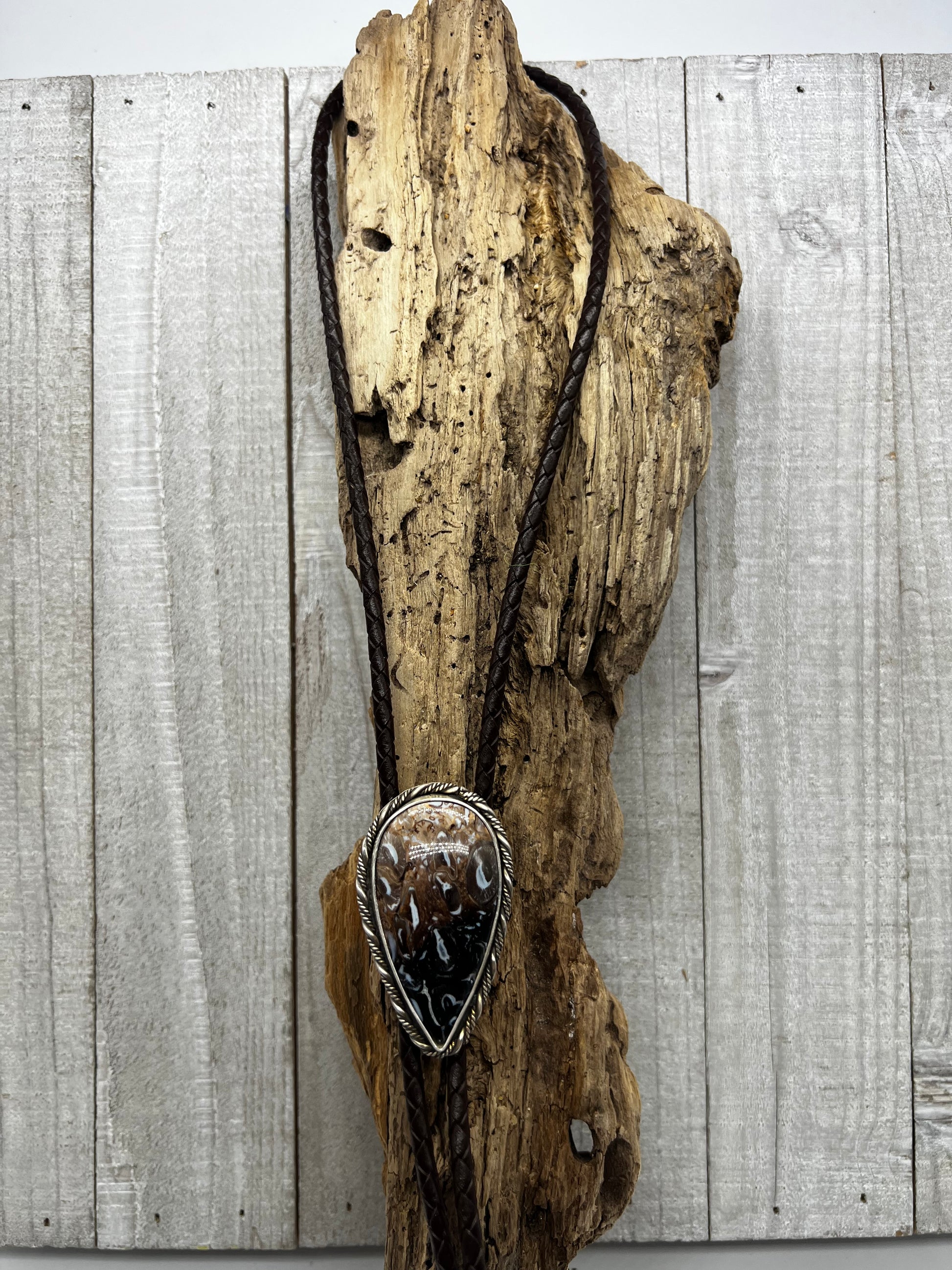 This beautiful, bold and colorful Palm Root Agate Statement Bolo Tie is set in 925 Sterling Silver with an easy to use mechanism for adjusting the 40” Dark Brown Braided Leather Cord with silver metal decorative tips.