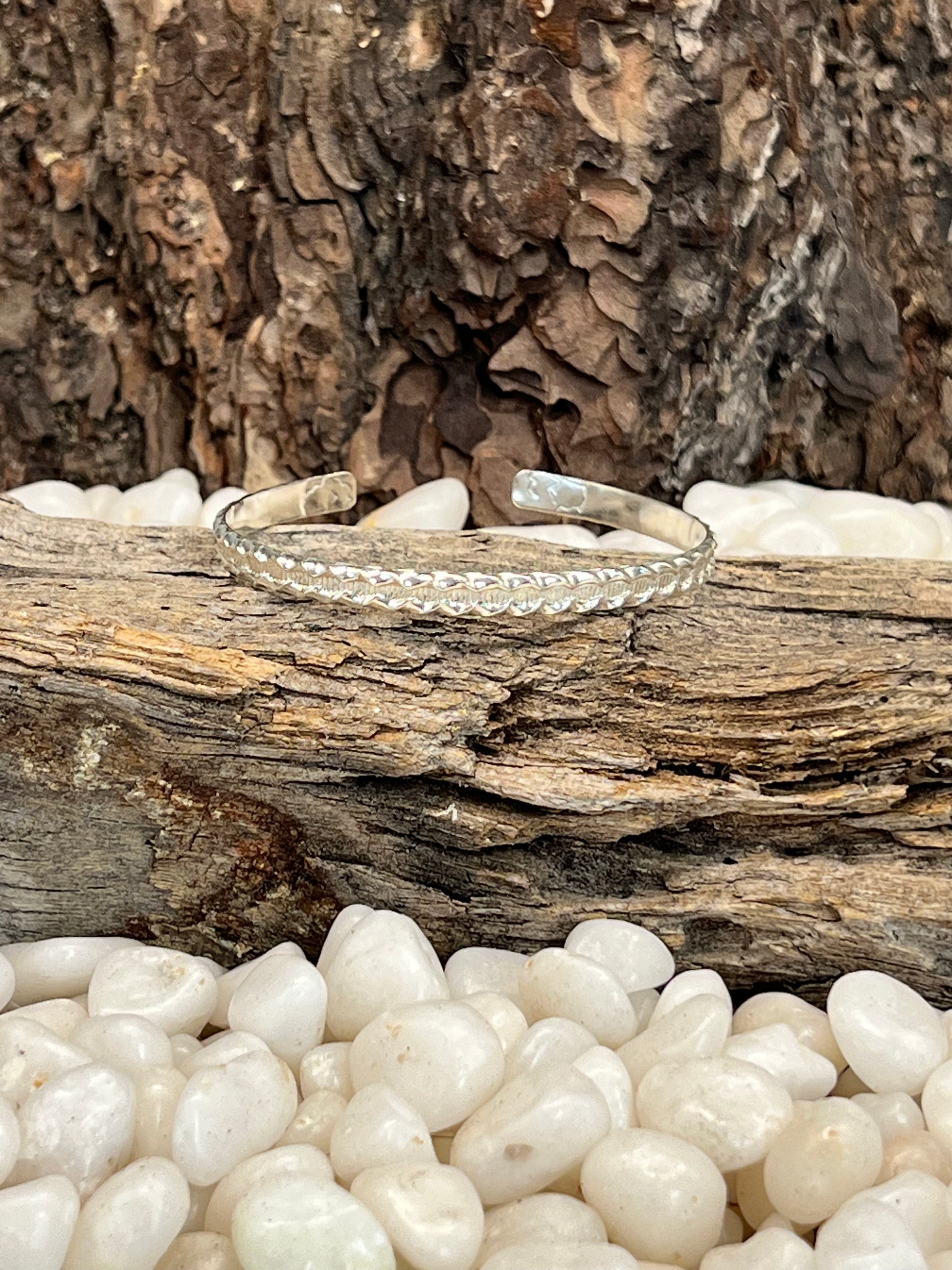 Decorative Sterling silver 5.75” (medium) cuff. Can be worn individually or as a stacking cuff to complimentary multiple bracelets/cuffs.